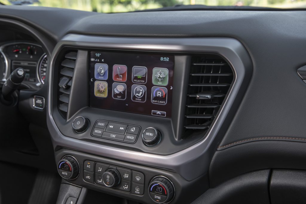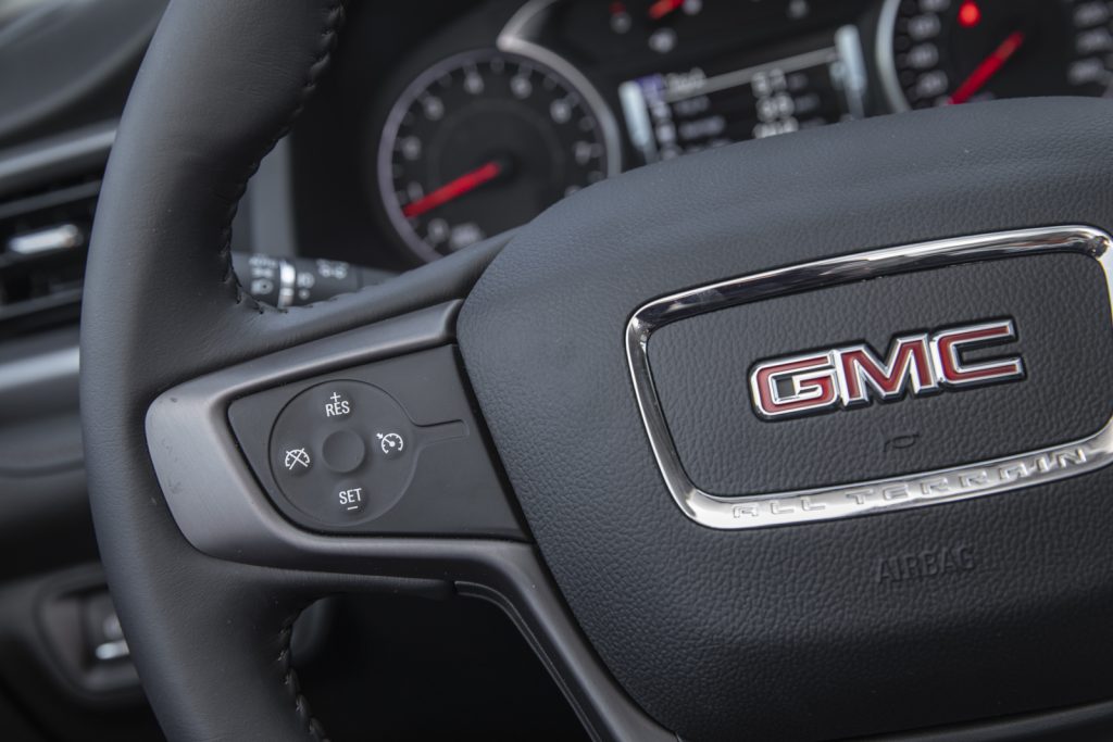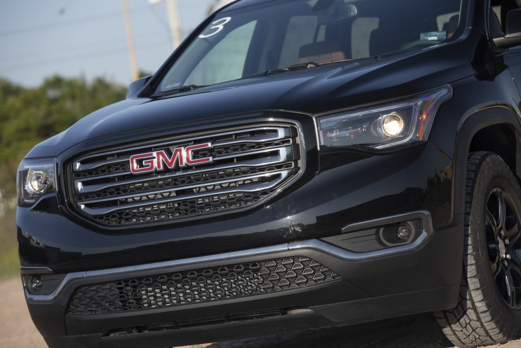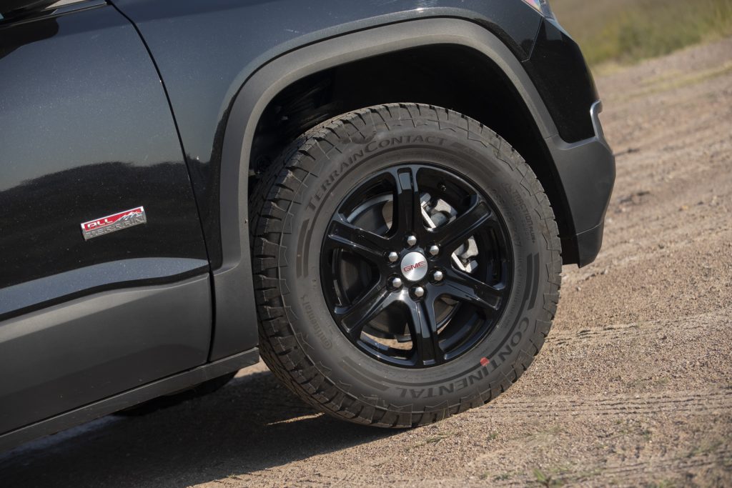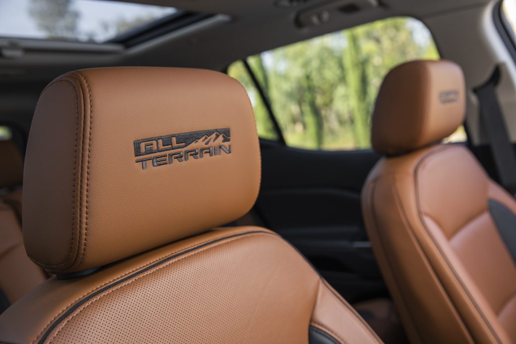 Esta Acadia All Teraain llega a suplir a la versión de entrada SLT y en su exterior cuenta con elementos en cromo negro como rieles, parrilla y molduras así como rines de 17″ que van montados sobre llantas todo terreno que la hacen más capaz y le dan un aspecto más rudo.