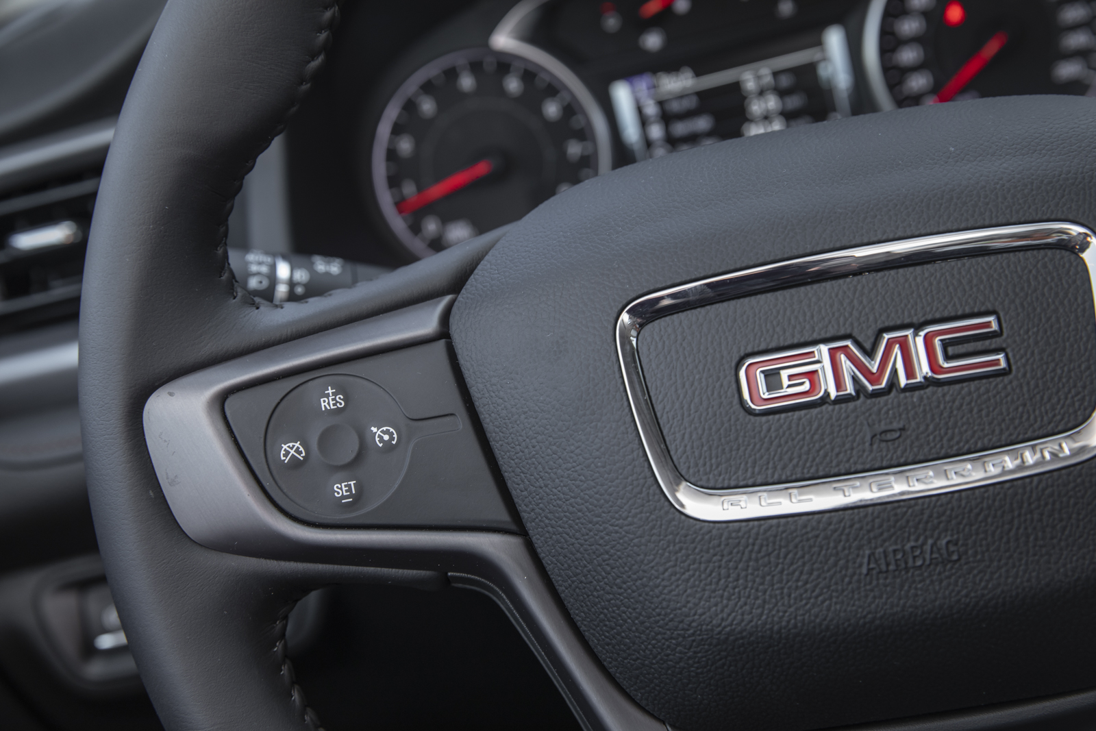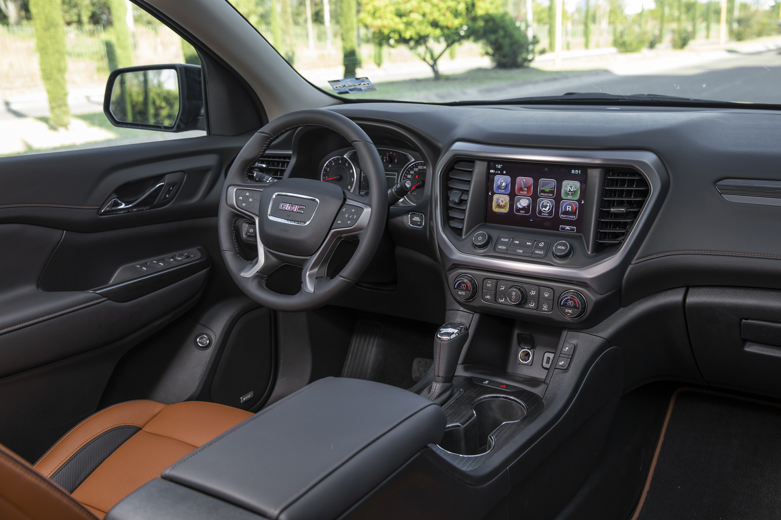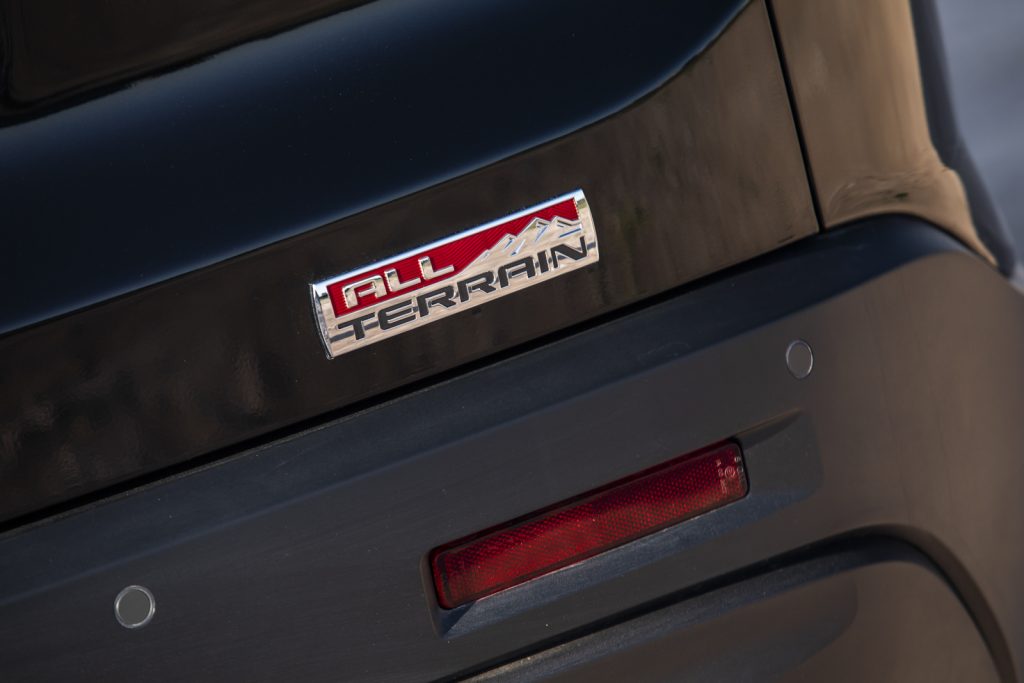 Esta Acadia All Teraain llega a suplir a la versión de entrada SLT y en su exterior cuenta con elementos en cromo negro como rieles, parrilla y molduras así como rines de 17″ que van montados sobre llantas todo terreno que la hacen más capaz y le dan un aspecto más rudo.