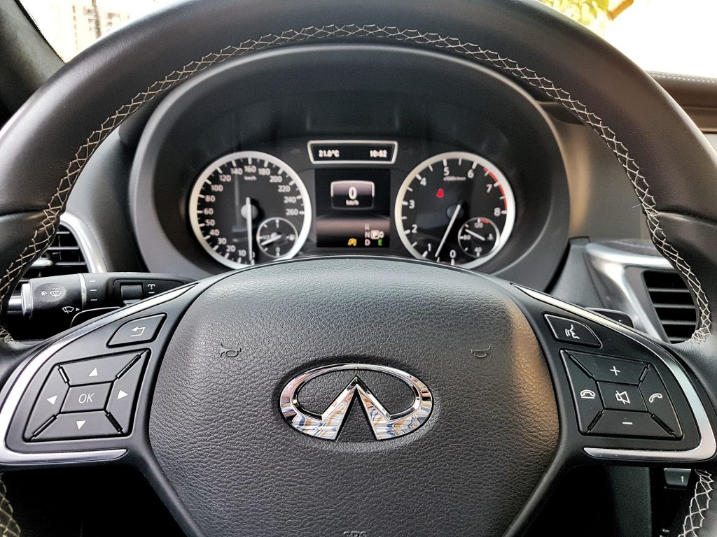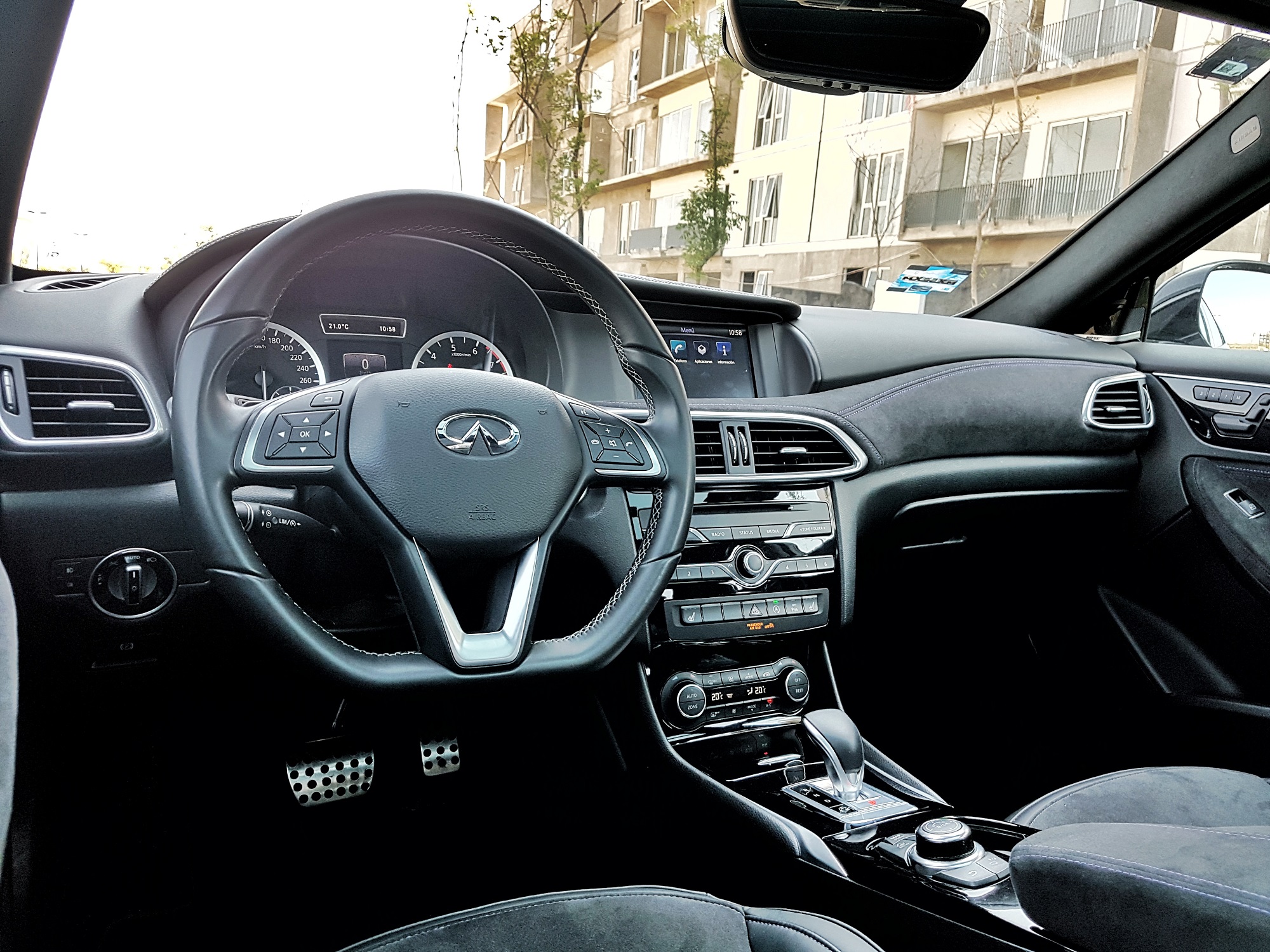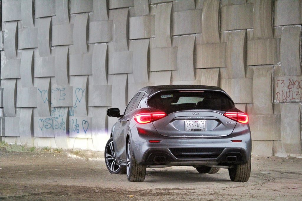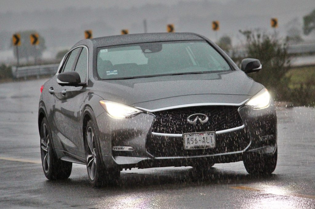 Detrás del volante el QX30 otorga ligeras sensaciones deportivas tanto en motor, suspensión, dirección y aún más cuando se pone el modo de manejo deportivo. La aceleración es buena, sin sorprender mucho y su velocidad máxima está por encima de los 200 km/h, velocidad en la que el auto se comporta bien gracias a la buena puesta a punto del chasís.
