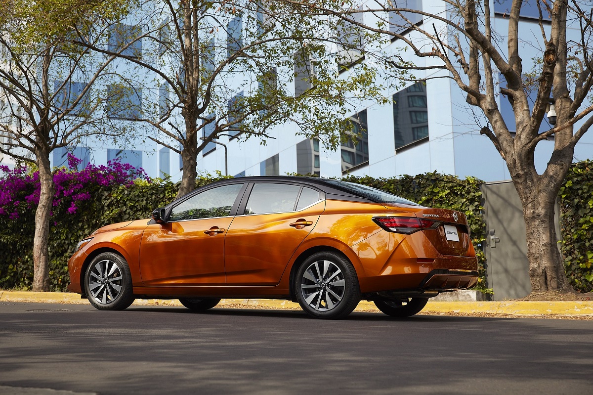 El diseño exterior del nuevo Sentra es parecido a lo visto en los nuevos Versa y Áltima, con líneas marcadas, parrilla V Motion y un aspecto deportivo. Todas las versiones cuentan con rines de aluminio y sensores de reversa, la versión Advance agrega faros antiniebla, retrovisores con direccional y cámara de reversa, la versión SR tiene detalles deportivos como spoiler trasero, faldones laterales, fascia trasera deportiva y rines de 18″.