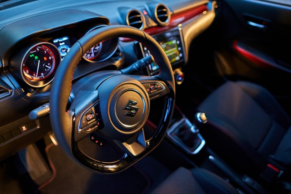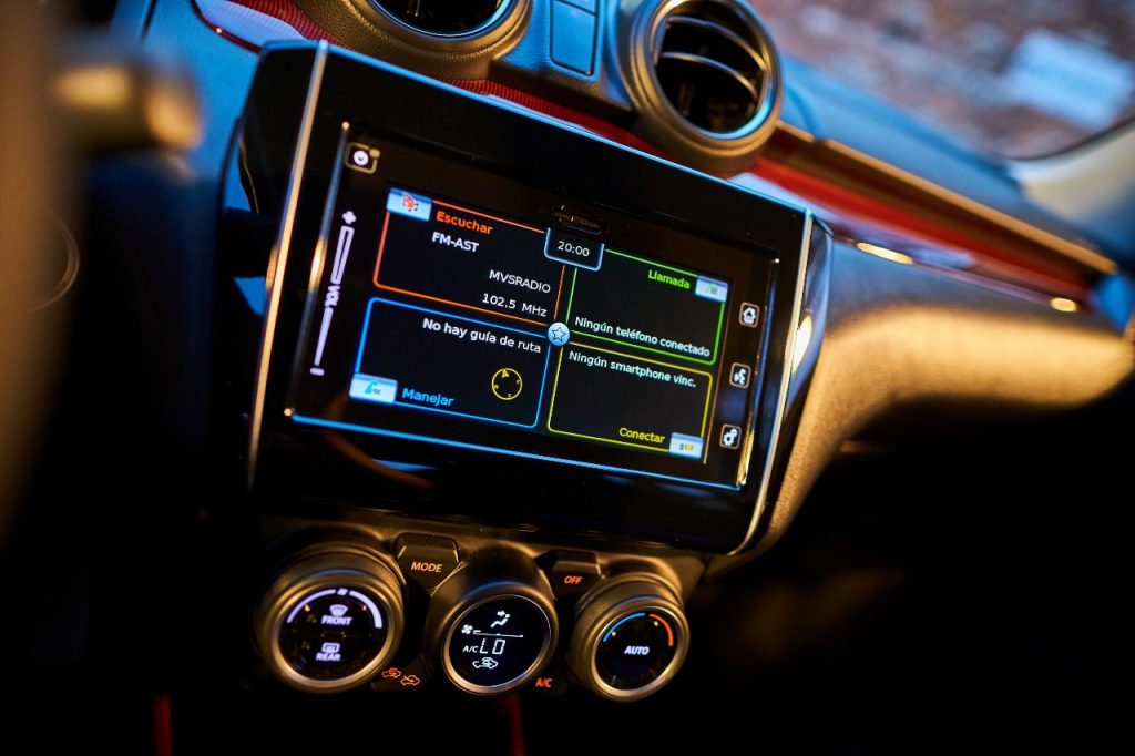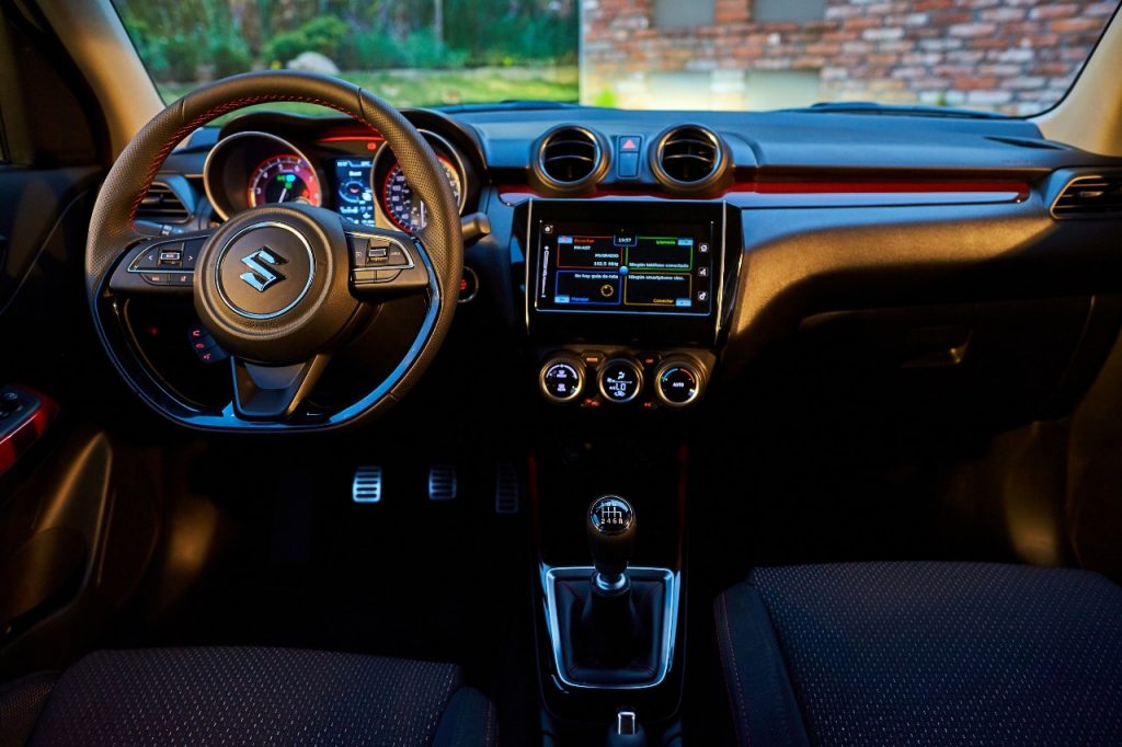 El equipamiento es completo, la computadora de viaje nos regala menús deportivos como las fuerzas G y el boost del turbo mientras que el sistema de infotenimiento es el mismo de los demás Swift y cuenta con Android Auto y Apple CarPlay. En seguridad tiene 6 bolsas de aire, frenos ABS, control electrónico de estabilidad y listo.